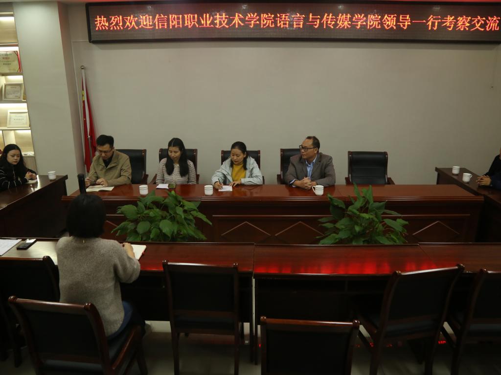 10月14日,信阳职业技术学院语言与beat365平台官方网站副院长梁维东、蒋吉优一行来beat365官网考察交流。吕东亮院长、田华副院长出席座谈会。