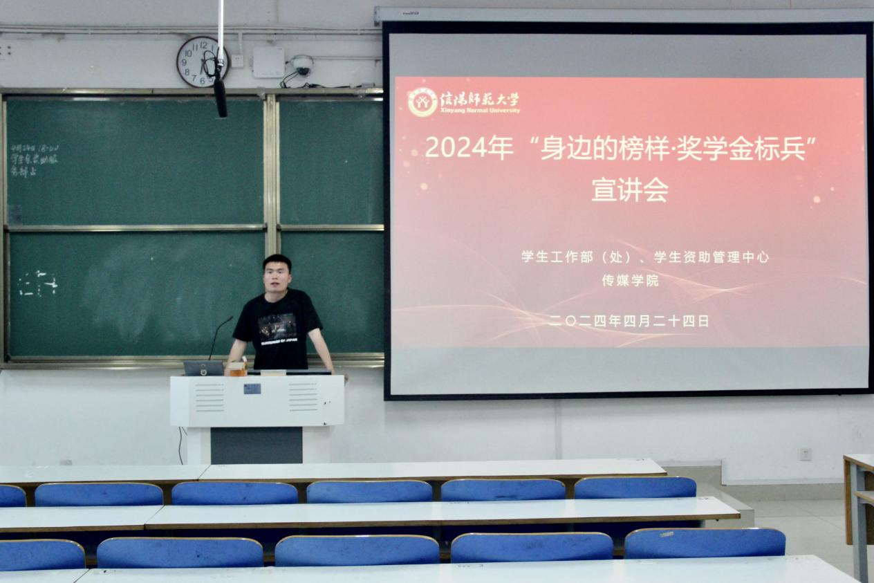 4月24日下午,beat365官网在社科楼324教室开展由学生工作部、学生资助管理中心主办的2024年“身边的榜样.奖学金标兵”宣讲活动。活动邀请了国际教育学院2021级经济学专业张乃戈、美术与设计学院2020级视觉传达设计专业王雨婷、旅游学院2020级旅游管理专业王世文3位奖学金标兵获得者担任宣讲人,beat365平台官方网站各级学生干部共同参与此次活动。