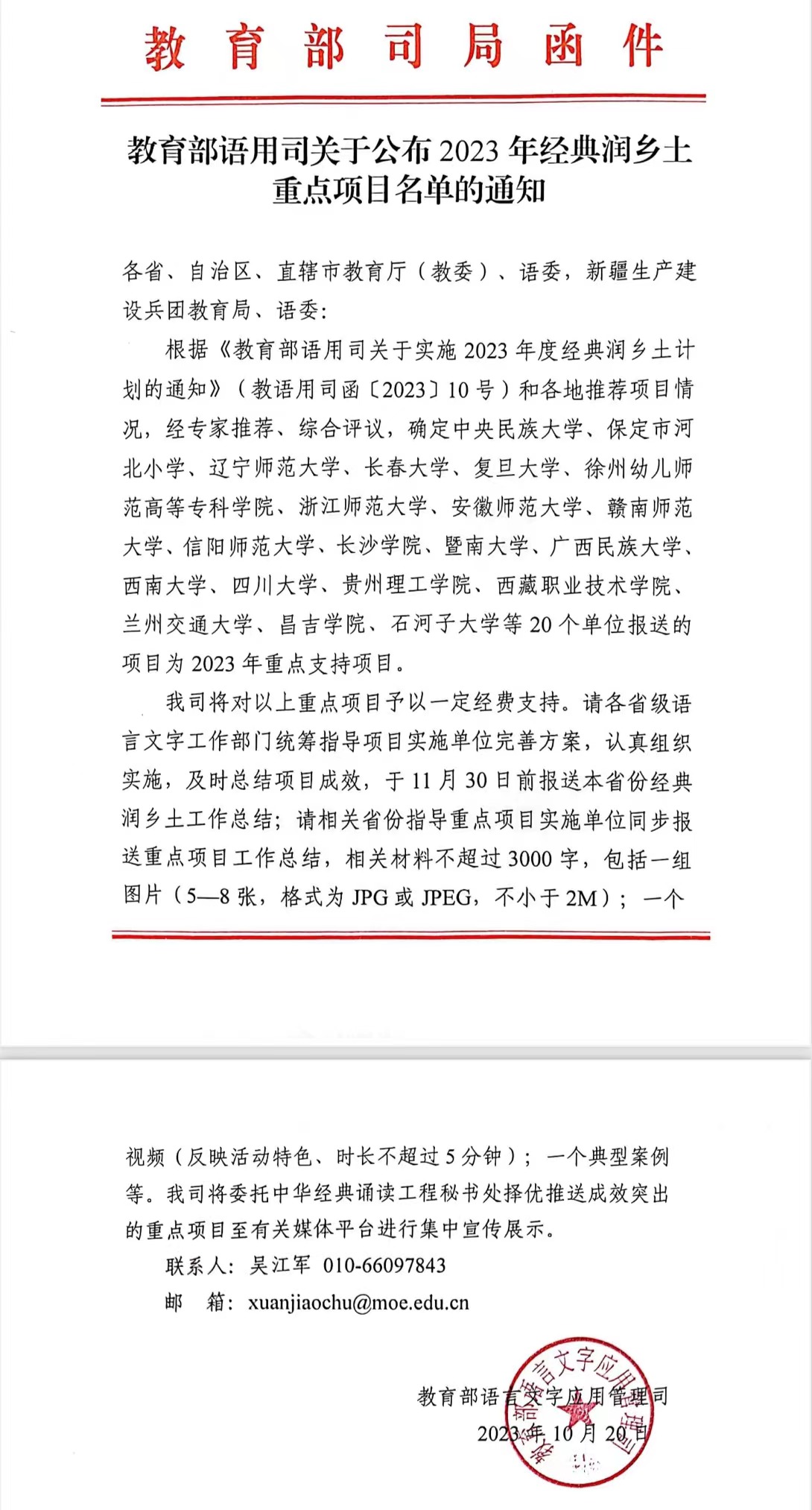 “经典润乡土计划”是教育部、国家乡村振兴局、国家语委联合组织实施的“国家通用语言文字普及提升工程和推普助力乡村振兴计划”的重要组成,以提升国家通用语言文字教育教学质量、提高语言文字科技赋能水平、增强国民语言文字应用能力和语言文化素养为目标,本次评选共有20家单位报送的项目为2023年教育部重点支持项目。