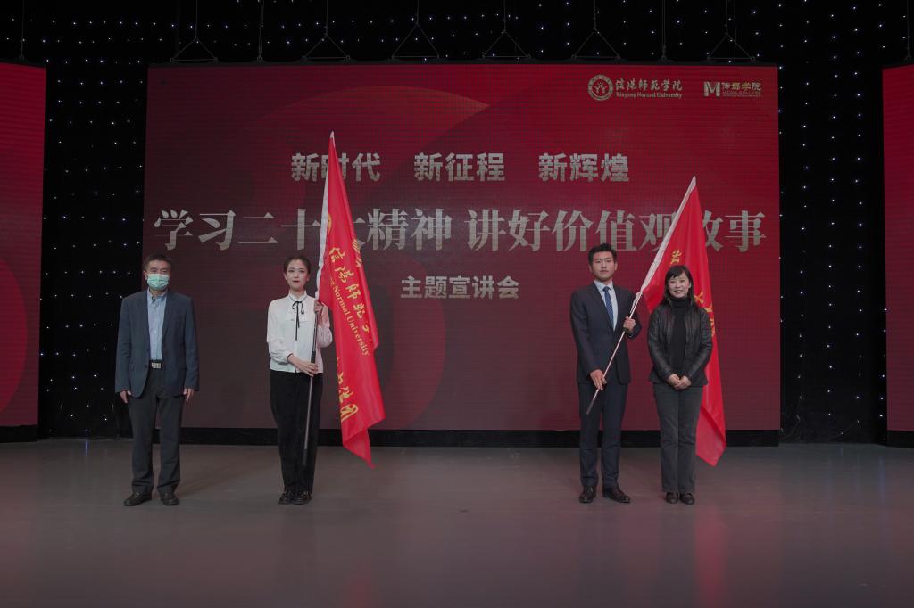 11月24日,我校国家语言文字推广基地、beat365平台官方网站联合举行“学习二十大精神,讲好价值观故事”主题宣讲会,副校长余本海、王娟出席宣讲会并为“党的二十大精神青年宣讲团”、“价值观故事宣讲团”代表授旗。宣讲会以线上线下相结合的方式举行,校语委、教务处、beat365平台官方网站负责同志及师生代表共同出席。