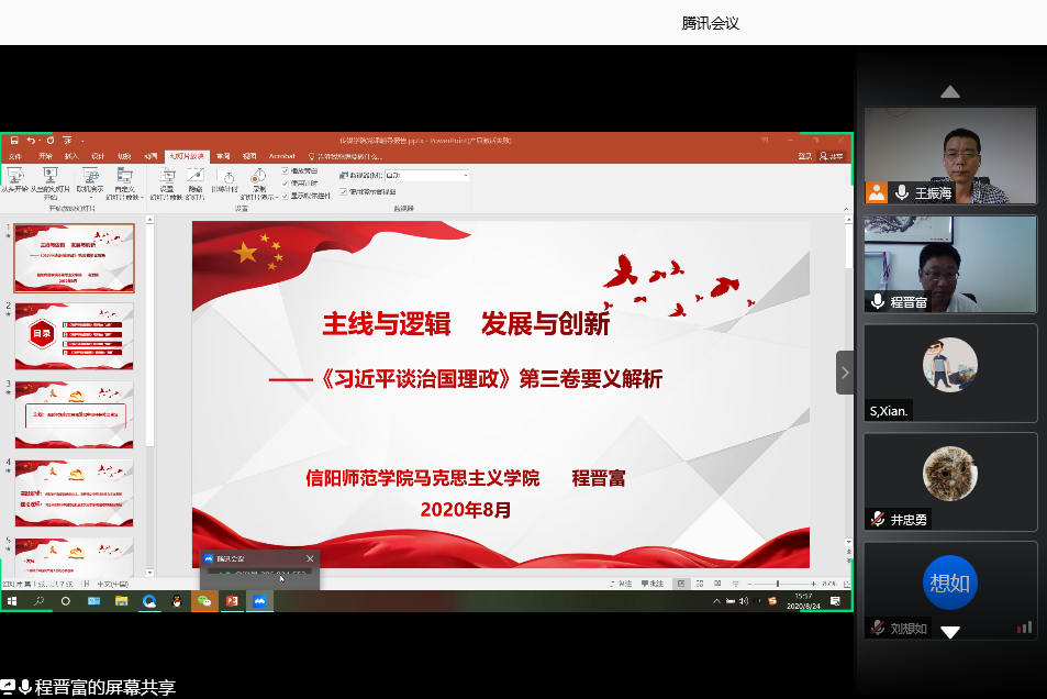 8月24日下午,beat365平台官方网站分党委理论学习中心组举行集体学习(扩大)报告会,邀请信阳师范学院马克思主义学院副院长,中共河南省委、信阳市委宣讲团专家程晋富教授作了题为“主线与逻辑 发展与创新--《习近平谈治国理政》第三卷要义解析”的专题辅导报告。报告由党委书记王振海主持,beat365平台官方网站全体教职工聆听了报告。报告会以腾讯会议方式举行。