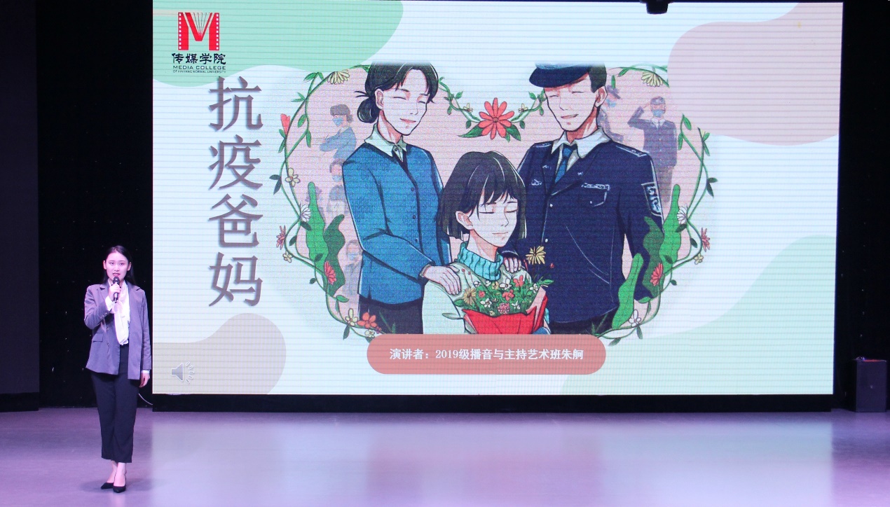 专题党课上,牛梦蕾同学讲述故事《对不起,妈妈不能守着你》,生动形象的向我们展示出母爱的博大无私和庄严神圣;魏晓琳同学讲述了她心中的英雄,让我们进一步的了解到抗疫英雄们散发的无限光辉;朱舸同学通过故事《抗疫爸妈》以弘扬抗疫英雄为打赢疫情防控阻击战而舍小家为大家的崇高精神;曹雯晶同学通过讲述信阳市中心医院“失约新娘”罗兰兰的真实故事表达出抗疫英雄“舍家为国,不计个人“的责任与担当;张瑞鹏、王汉玉、王静雅、高佳新四位同学的《致敬英雄》,表达出传媒学子对抗疫英雄真诚的敬意。感人的故事,真挚的情感,使现场不时响起阵阵掌声。