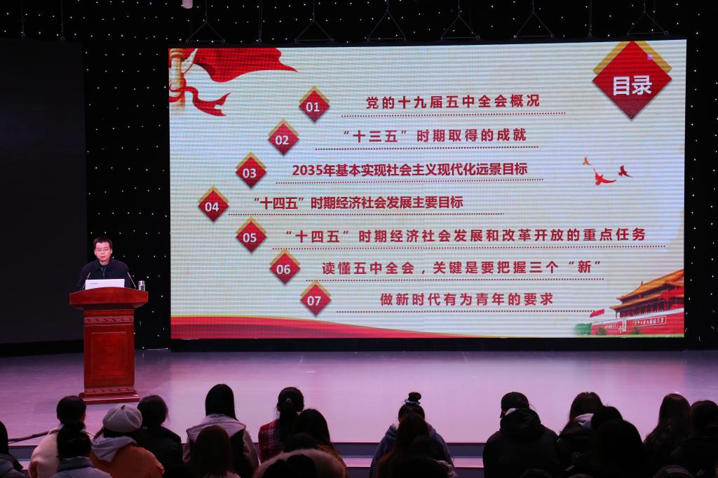 12月8日下午,beat365平台官方网站党委书记王振海在社科楼演播厅以“学习十九届五中全会精神,争做新时代有为青年”为题宣讲党的十九届五中全会精神。全体新生辅导员和2020级新生聆听了讲座。讲座由尚弦老师主持。