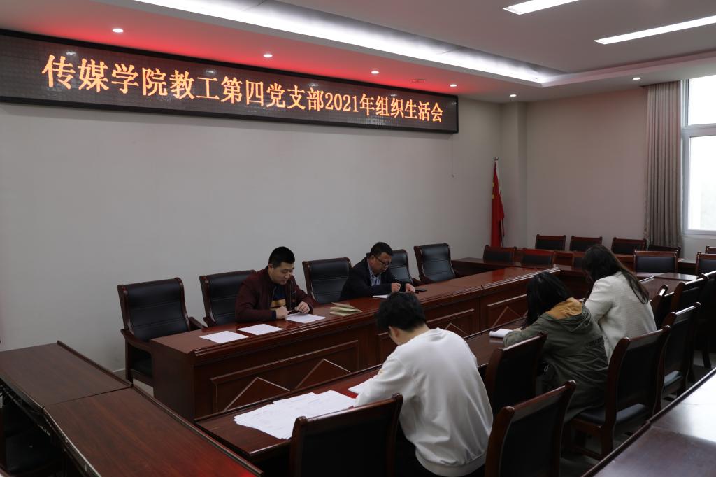 3月15日下午,教工第四党支部在社科楼311会议室召开了2021年组织生活会。会议由支部书记段金龙同志主持,支部全体党员参加,院长吕东亮同志以普通党员身份参加了会议。