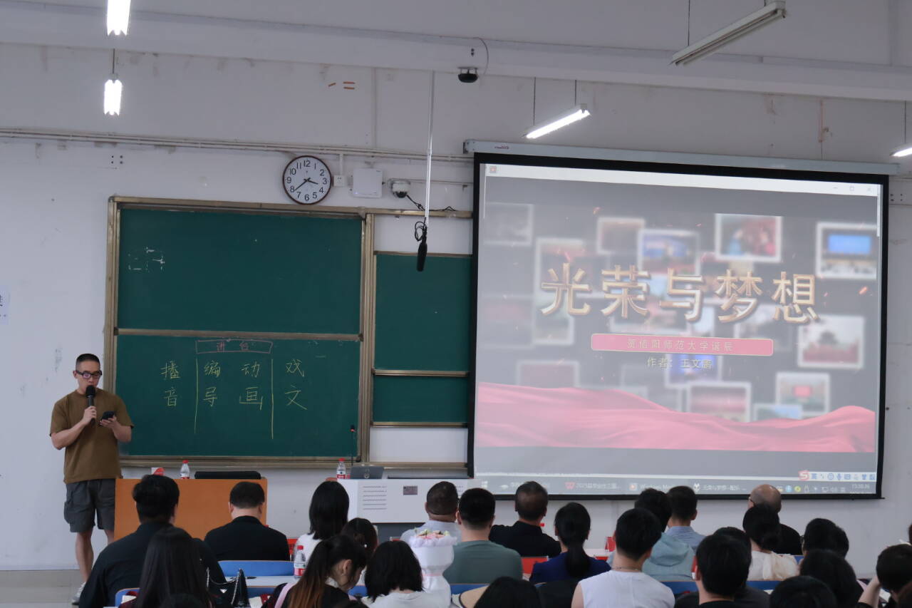 活动伊始,21级播音与主持艺术班班主任江远方带领毕业生们共同观看并朗诵《光荣与梦想》。师生以声传情,将五十载校史融入诵读的起承转合之间,用深情朗诵向母校五十华诞献礼,用专业所学对四年大学时光告别。