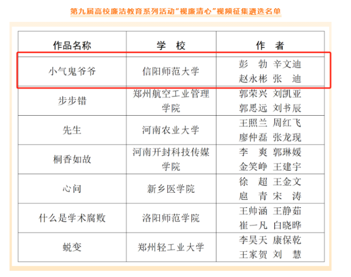 近日,教育部思想政治工作司公示了第九届高校廉洁教育系列活动评选结果,河南高校共有20部作品和4名高校师生入选,beat365官网报送的动画作品《小气鬼爷爷》入选“视廉清心”视频征集遴选名单。