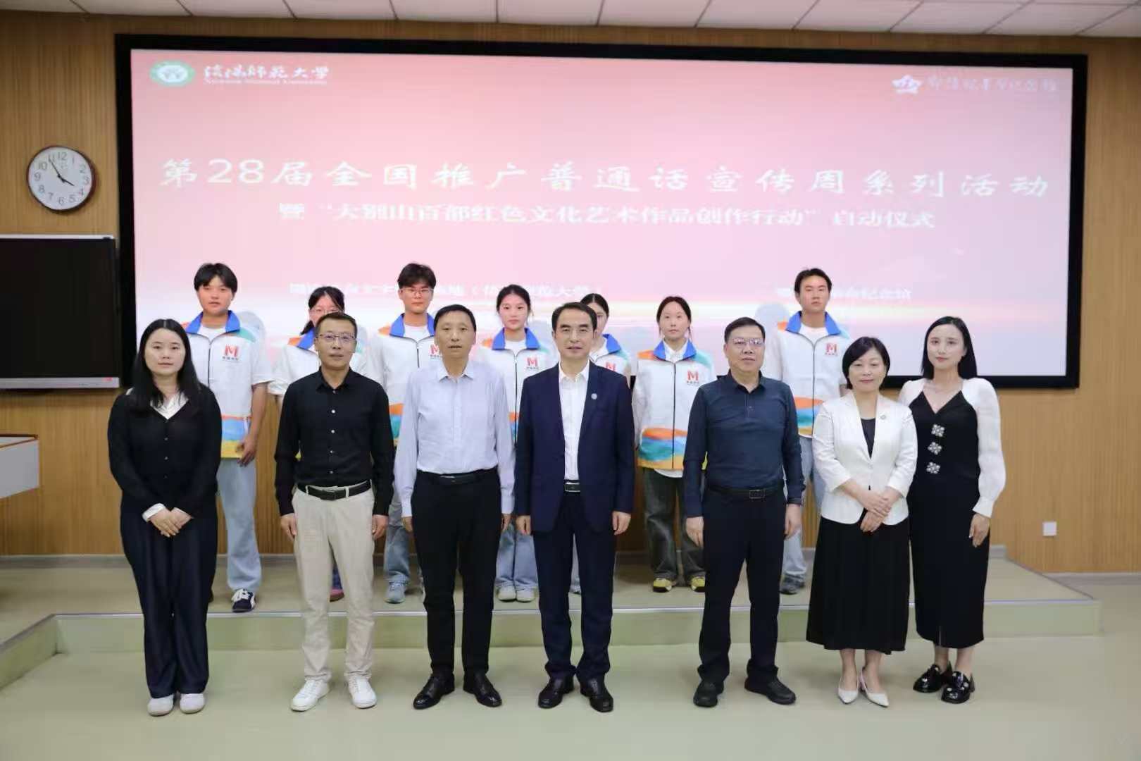 9月18日下午,值此“九一八”事变94周年纪念日,我校第28届全国推广普通话宣传周系列活动暨“大别山百部红色文化艺术作品创作行动”启动仪式在社科楼120智慧教室隆重举行。师生齐聚一堂,在铭记历史、缅怀先烈的同时,开启红色文化传承新篇章。副校长武治国、信阳市委宣传部二级调研员张继峰、鄂豫皖革命纪念馆馆长查智力、beat365平台官方网站领导班子及师生代表出席活动。本次活动由beat365平台官方网站副院长田华主持。